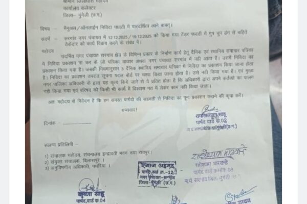 सरगांव। नगर पंचायत सरगांव में विभिन्न विकास कार्यों के लिए जारी की गई ई-टेंडर प्रक्रिया में गंभीर अनियमितताओं का आरोप लगाते हुए कांग्रेसी पार्षदों ने संचालक, नगरीय प्रशासन एवं विकास विभाग नया रायपुर, मंत्री नगरीय प्रशासन एवं विकास विभाग, संयुक्त संचालक बिलासपुर, कलेक्टर मुंगेली तथा अनुविभागीय अधिकारी (राजस्व) पथरिया को लिखित शिकायत सौंपी है। पार्षदों…