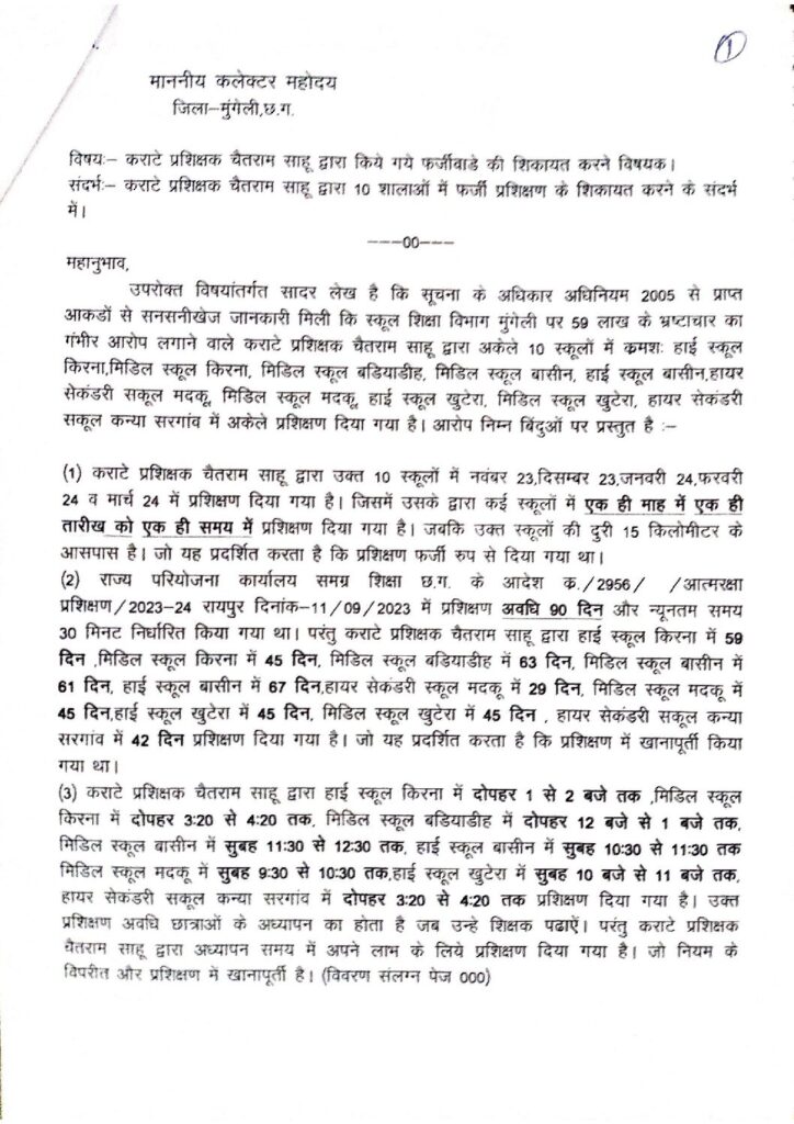 शिक्षकों ने अवकाश दिवसों में प्रशिक्षण दिए जाने की शिकायत दर्ज कराई है। आवेदन में बताया गया है कि सूचना के अधिकार अधिनियम से प्राप्त जानकारी के अनुसार कराटे प्रशिक्षक चैतराम साहू द्वारा विभिन्न विद्यालयों में प्रशिक्षण दर्शाकर पैसों की वसूली की गई है। शिकायतकर्ताओं के अनुसार प्रशिक्षक द्वारा जिन तिथियों में प्रशिक्षण दर्शाया गया है, वे अधिकांशतः अवकाश दिवस रहे हैं। इनमें—