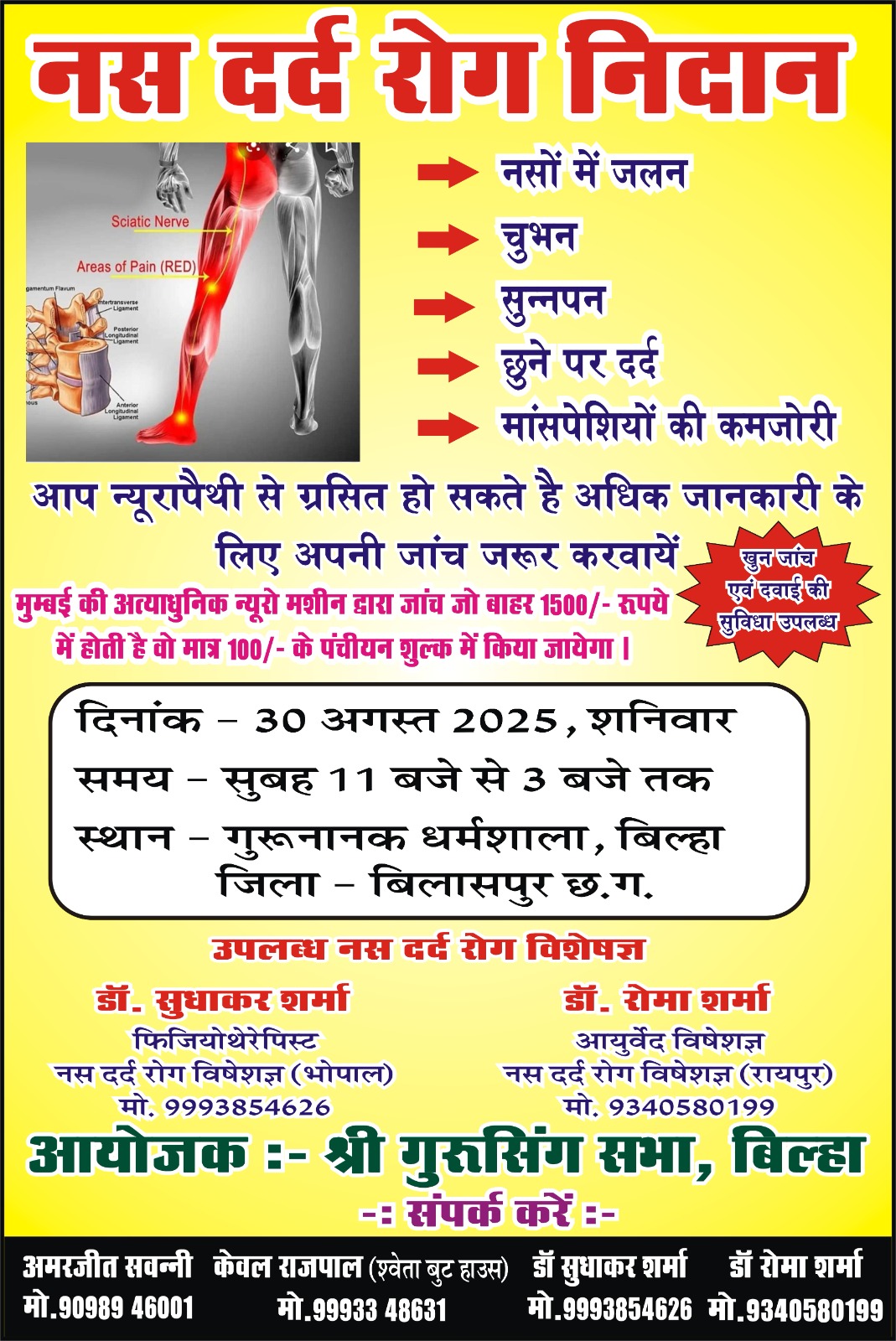 बिल्हा ।। 30 अगस्त शनिवार को श्री गुरुनानक धर्मशाला बिल्हा मे नस दर्द जाँच एवं निदान शिविर लगाया जा रहा है। शिविर मे मुंबई की अत्याधुनिक न्यूरोपैथी मशीन द्वारा कमर दर्द, गर्दन मे दर्द, पैरों की नसों मे दर्द,सुन्नपन, कमजोरी, झुनझुनी एवं डायबिटीक न्यूरोपैथी सम्बंधित रोगों का अत्याधुनिक मशीनों से जाँच होगी । महानगरों में यह जक जाँच 1500-2000 में होती है शिविर में मात्र 100 रुपए के पंजीयन में किया जाएगा ,शिविर सुबह 11 बजे से दोपहर 3 बजे तक रहेगा। फिजियोथेरेपिस्ट डॉ सुधाकर शर्मा एवं आयुर्वेदिक विशेषज्ञ डॉ रोमा शर्मा उपस्थित रहेंगे, शिविर मे कमर दर्द, नस दबने, घुटने का दर्द, पीठ का दर्द, साइटिका, स्लिप डिस्क, लकवा, एवं दर्द सम्बंधित रोगों की जाँच एवं परामर्श रहेगा।साथ ही खून जांच एवं दवाईयों की सुविधा भी उपलब्ध रहेगी।भाटापारा के शारदा हॉस्पिटल के डॉ सुधाकर शर्मा ने पिछले पंद्रह सालो मे नस दबने के कई मरीजों का सफलता पूर्वक इलाज किया है l पंजीयन श्री गुरुनानक धर्मशाला मे करा लेवें। अग्रिम पंजीयन के लिए अमरजीत सवन्नी ( 090989 46001) केवल राजपाल (श्वेता बूट हाउस) (99933 48631 )डॉ सुधाकर शर्मा (9993854626) डॉ रोमा शर्मा (9340580199)से संपर्क करें।