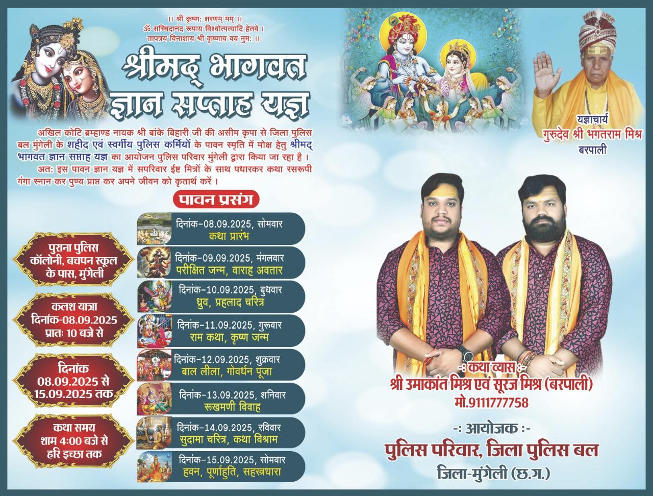 मुंगेली। जिला पुलिस परिवार एवं जिला पुलिस बल मुंगेली द्वारा 08 से 15 सितंबर 2025 तक श्रीमद् भागवत ज्ञान सप्ताह यज्ञ का आयोजन पुराना पुलिस कॉलोनी, बचपन स्कूल के पास किया जा रहा है। इस आयोजन का उद्देश्य जिला पुलिस के शहीद एवं दिवंगत पुलिसकर्मियों को श्रद्धांजलि अर्पित करना और समाज में धार्मिक व सांस्कृतिक मूल्यों को बढ़ावा देना है।