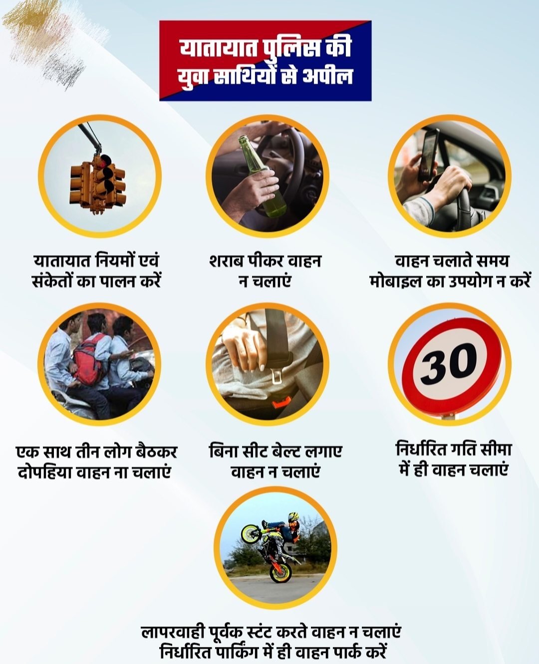- ट्रैफिक सिग्नल एवं चिन्हों का पालन करें