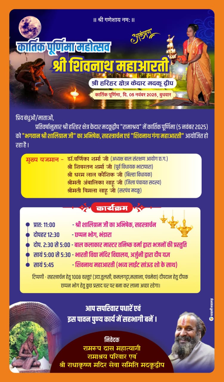 सरगांव/ मदकूघाट// । देव दीपावली के पावन अवसर पर सदानीरा शिवनाथ नदी के तट पर दीपदान महोत्सव का भव्य आयोजन किया जा रहा है। श्री हरिहर क्षेत्र केदार द्वीप सेवा समिति, मदकू द्वारा आयोजित यह परंपरागत कार्यक्रम इस वर्ष अपने 24वें वर्ष में प्रवेश कर रहा है।