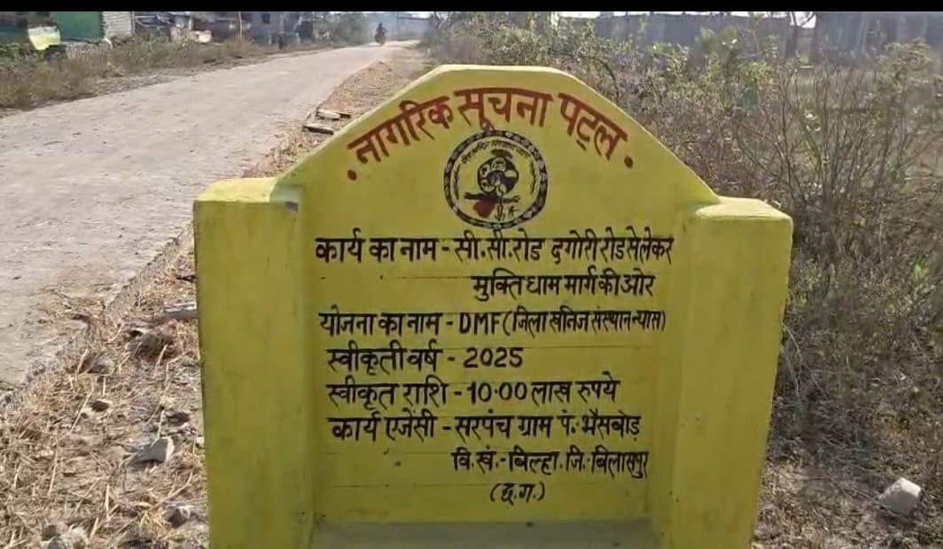 बिलासपुर जिले के बिल्हा क्षेत्र अंतर्गत ग्राम पंचायत भैंसबोड में दगौरी–बिल्हा मेन रोड से मुक्तिधाम रोड तक लगभग 10 लाख रुपये की लागत से 400 मीटर सीसी रोड का निर्माण कराया गया। लेकिन निर्माण कार्य पूरा हुए महीने भर भी नहीं हुए और सड़क में जगह-जगह दरारें पड़ गई हैं, गिट्टी निकलने लगी है और धूल उड़ रही है।