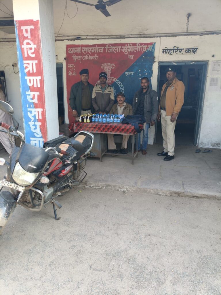 मुंगेली। थाना सरगांव पुलिस ने अवैध शराब परिवहन के मामले में बड़ी कार्रवाई करते हुए दो आरोपियों को गिरफ्तार किया है। पुलिस को मुखबिर से सूचना मिली थी, जिसके आधार पर सरगांव–खपरी रोड पर सरगांव कॉलेज के पास घेराबंदी कर मोटरसाइकिल HF डीलक्स क्रमांक CG 28 L 6327 को रोका गया।