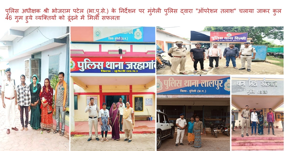 पुलिस अधीक्षक श्री भोजराम पटेल (भा.पु.से.) के नेतृत्व में मुंगेली पुलिस ने “ऑपरेशन तलाश” के तहत बड़ी सफलता प्राप्त की है। इस विशेष अभियान में जिले से गुमशुदा हुए कुल 46 व्यक्तियों को खोजकर उन्हें उनके परिवारजनों से सकुशल मिलाया गया, जिससे उनके परिजनों के चेहरों पर खुशी लौट आई।